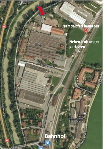 Wegbeschreibung:Vor dem Bahnhof links in die Industriestrasse, etwa 1 min fahren, ca. 20m vor der grossen blauen Halle mit der Aufschrift „Angenstein“ Trampelpfad links rein (Es gibt dort ein Robidog und eine Ausschilderung „Hundeträff“). Wichtig: Parkieren Sie auf der rechten Seite neben dem Bahngleis entlang den Holzstapeln.