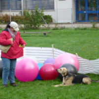 Treibball - der ultimative Sport für unternehmungslustige HundeDie Spielregeln sind einfach: Acht Gymnastikbälle verschiedener Grösse, die in einem Dreieck angeordnet sind, werden vom Hund mit der Schnauze über den Rasen geschoben und in einem Tor versenkt. Auch der Hundehalter ist dabei aktiv, indem er seinen Hund mit Pfiffen, leisen Anweisungen und Körpersprache lenkt. Treibball fördert ungemein die Zusammenarbeit zwischen Mensch und Hund und ist eine artgerechte und sinnvolle Arbeit, da der Hund hier seinen Jagdtrieb spielerisch ausleben darf. Auch spricht diese Beschäftigung stark die Kopfleistung des Hundes an, was sich sehr positiv auf seine Ausgeglichenheit auswirken kann.